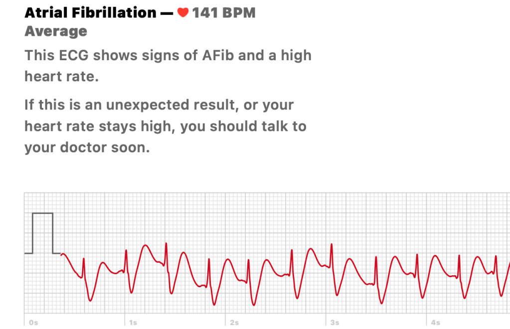 I quickly sat on the couch to stabilize myself, mind racing to understand the sensation. The fluttering became a crescendo of heavy erratic heart thumps, like a wild bull was set loose in my chest. Remembering the stories of a dear friend who has had several bouts of AFib, these jarring symptoms rang a bell. I fingered my Apple Watch, looking for the ECG app. Somehow I kept enough sense to calmly press on the crown for 30 seconds to get the reading you see above.
